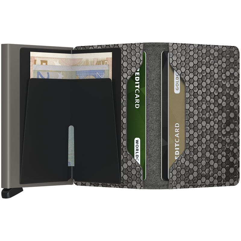 Kortskyddet är hjärtat i SECRID wallet. Genom att skjuta en liten spak åt sidan, förs dina kort ut ur kortskyddet i en överlappande sekvens. Detta kan du göra utan att ens öppna övriga delar av din plånbok och du hittar snabbt det kort du vill använda. Du plockar endast fram ett kort när du ska betala och så länge de andra finns kvar i aluminiumskalet, kan obehörig utrustning inte läsa av korten. Risken minimeras på detta vis ytterligare.