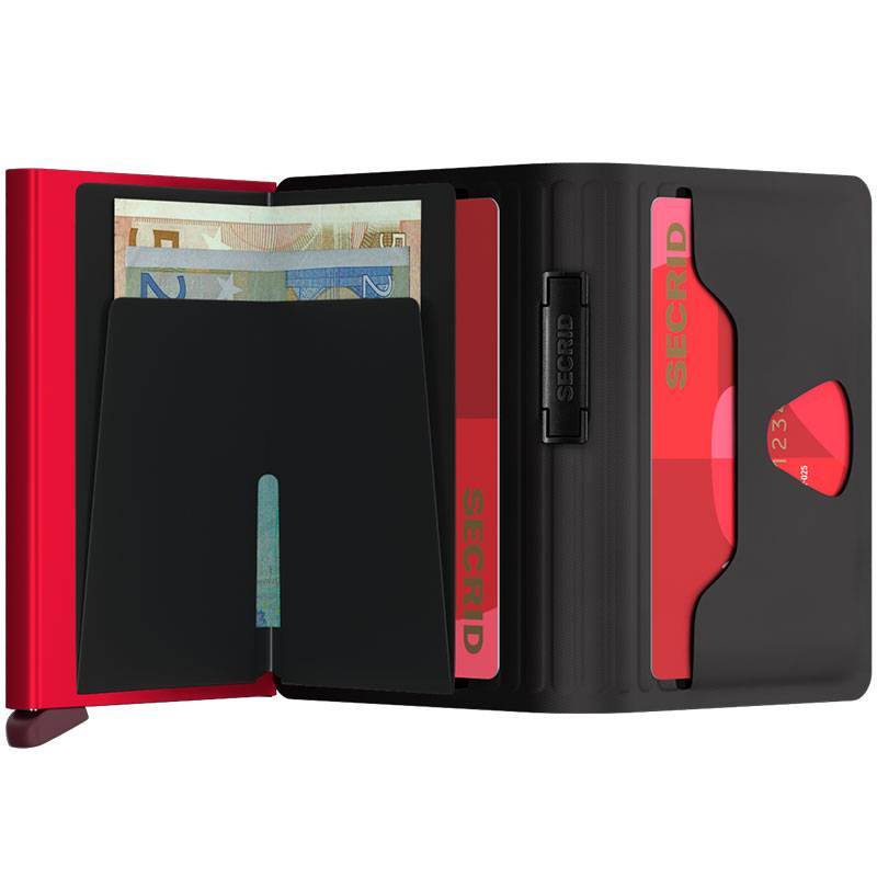 Kortskyddet är hjärtat i SECRID wallet. Genom att skjuta en liten spak åt sidan, förs dina kort ut ur kortskyddet i en överlappande sekvens. Detta kan du göra utan att ens öppna övriga delar av din plånbok och du hittar snabbt det kort du vill använda. Du plockar endast fram ett kort när du ska betala och så länge de andra finns kvar i aluminiumskalet, kan obehörig utrustning inte läsa av korten. Risken minimeras på detta vis ytterligare.