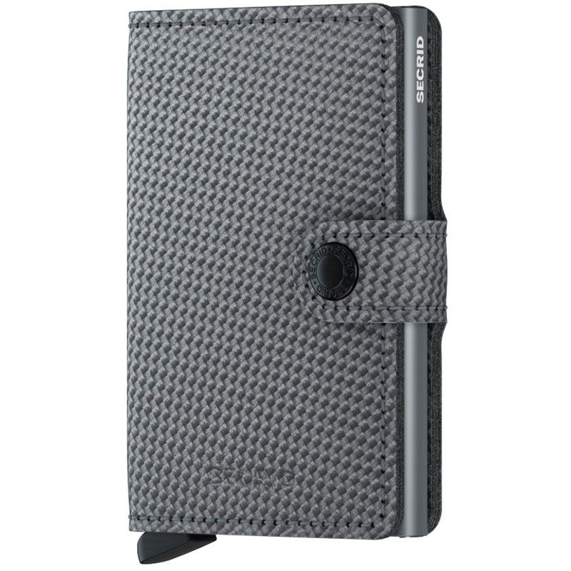 Secrid Miniwallet Carbon Cool Grey har ett vävmönster med inspiration från kolfiber för behandlingen av denna läderyta.