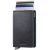 Kortskyddet är hjärtat i SECRID wallet. Genom att skjuta en liten spak åt sidan, förs dina kort ut ur kortskyddet i en överlappande sekvens. Detta kan du göra utan att ens öppna övriga delar av din plånbok och du hittar snabbt det kort du vill använda. Du plockar endast fram ett kort när du ska betala och så länge de andra finns kvar i aluminiumskalet, kan obehörig utrustning inte läsa av korten. Risken minimeras på detta vis ytterligare.