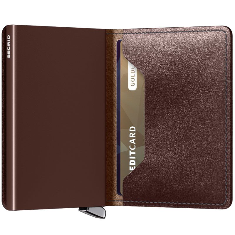 Kortskyddet är hjärtat i SECRID wallet. Genom att skjuta en liten spak åt sidan, förs dina kort ut ur kortskyddet i en överlappande sekvens. Detta kan du göra utan att ens öppna övriga delar av din plånbok och du hittar snabbt det kort du vill använda. Du plockar endast fram ett kort när du ska betala och så länge de andra finns kvar i aluminiumskalet, kan obehörig utrustning inte läsa av korten. Risken minimeras på detta vis ytterligare.