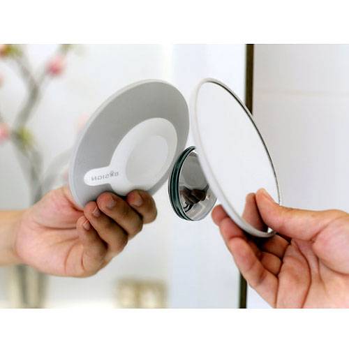 Spegeln har ett kombinerat fäste med sugpropps- och magnetfäste. Spegeln fästes med en stark sugpropp som sitter säkert på alla släta ytor som kakel, glas, plast eller metall. Spegeln sitter sedan magnetiskt mot sugproppsfästet, inga skruvar behövs.