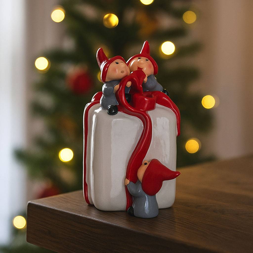 Här har de samlats kring ett stort, vitt paket med röd rosett – och gör sitt allra bästa för att få snöret att sitta perfekt. Figuren är designad av Camilla Ståhl för Nääsgränsgården och utstrålar den där välbekanta blandningen av humor, värme och julglädje som blivit hennes kännetecken.