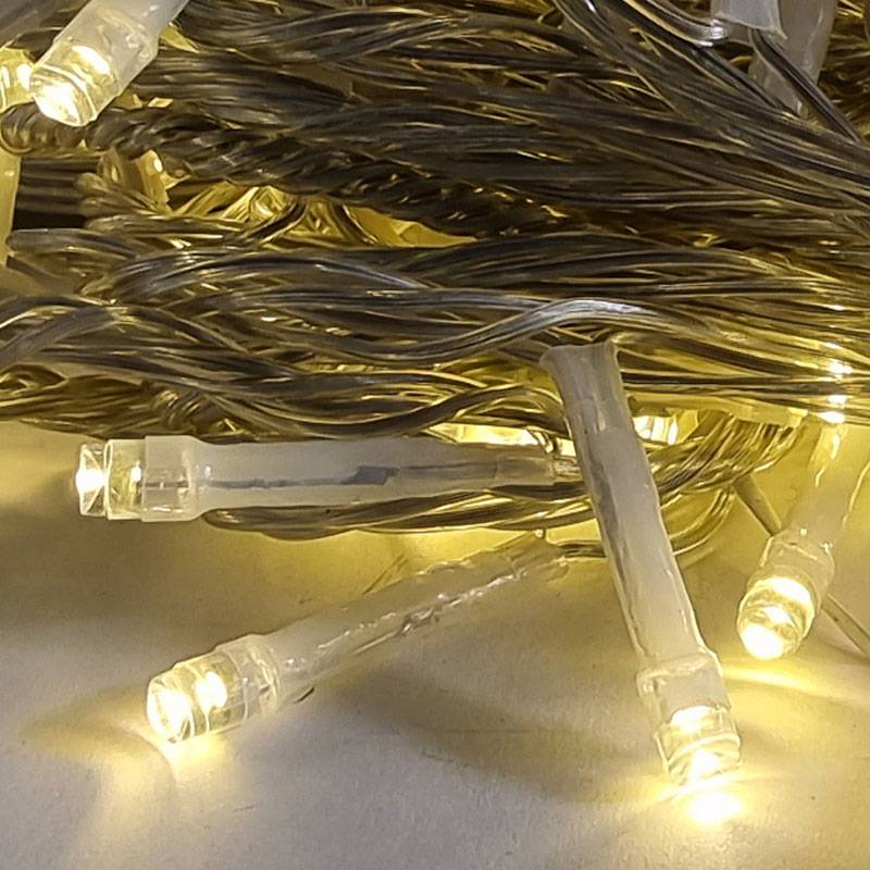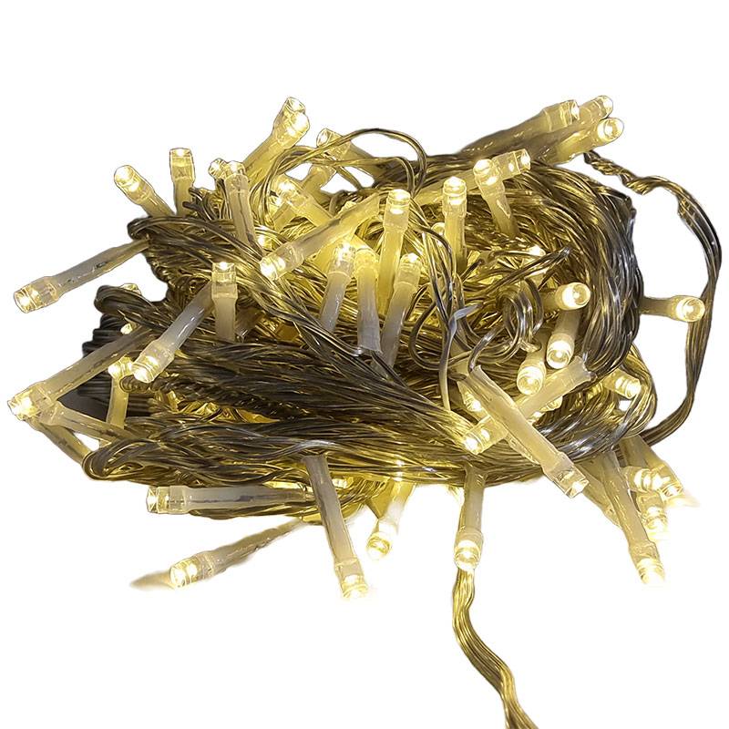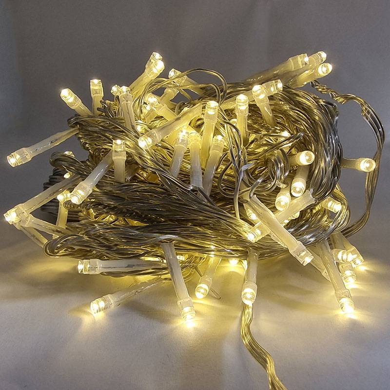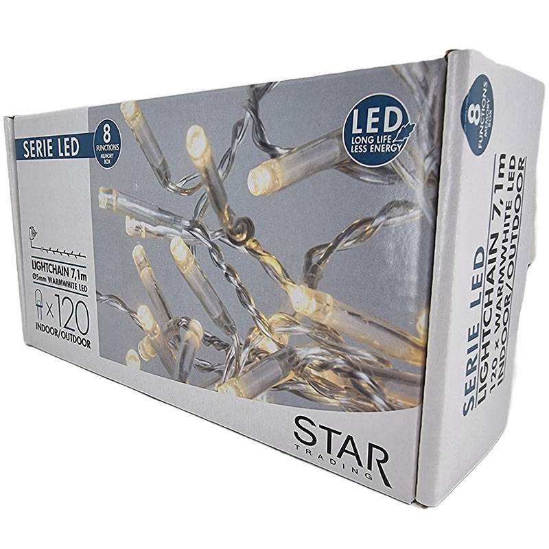 Serie LED ljusslinga med transparent kabel. Slingan är 7,1 meter lång och har 120 varmvita 5mm LED-ljuskällor. Vacker ljusslinga att dekorera med utomhus.