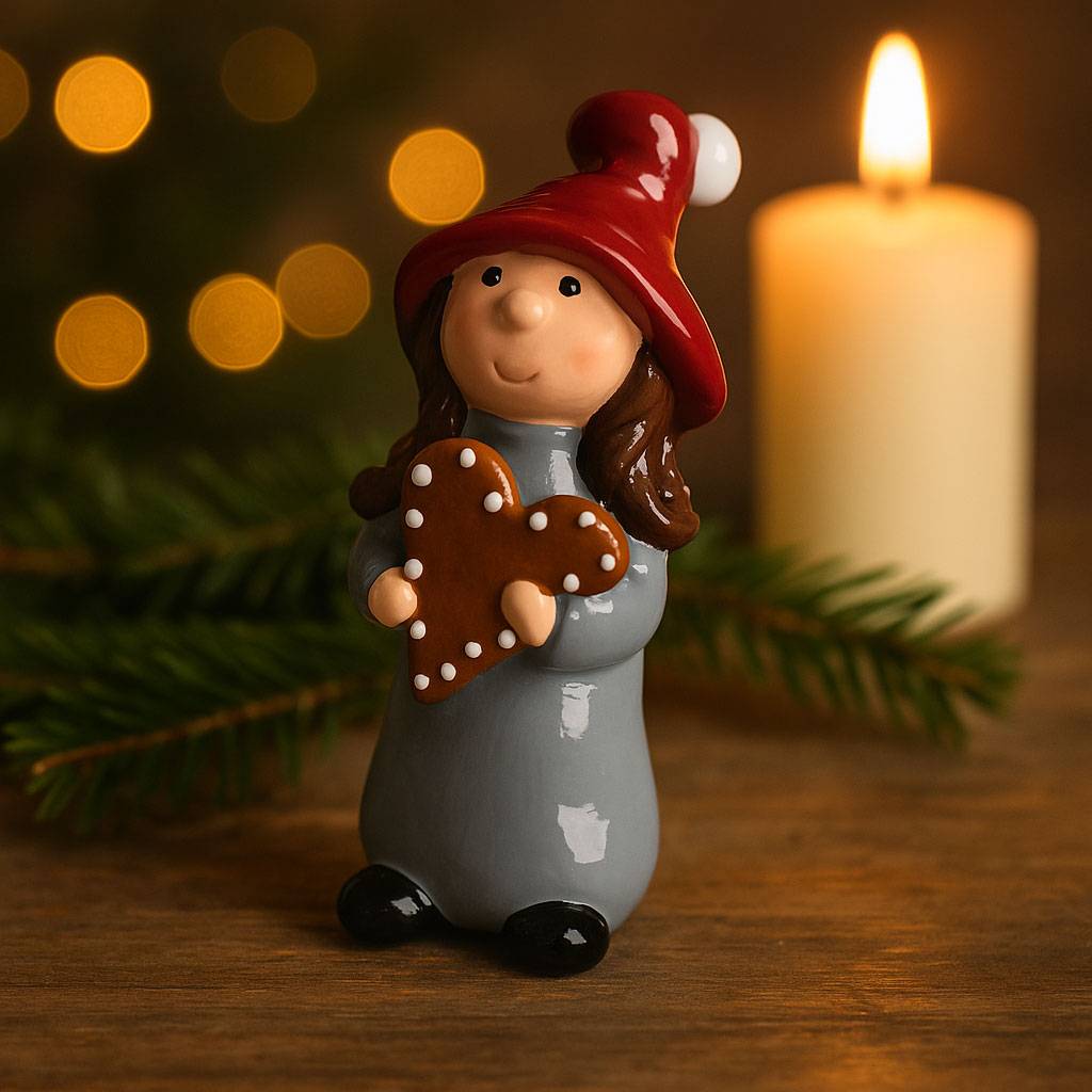 Lotta står stolt med sin pepparkaka i famnen, klädd i grå klänning och röd tomteluva med glansig yta. Varje detalj är handmålad med omsorg, vilket gör varje figur unik. Kombinationen av färg, form och uttryck gör henne till en söt detalj i julinredningen – perfekt att placera på en hylla, fönsterbräda eller bland granriset.