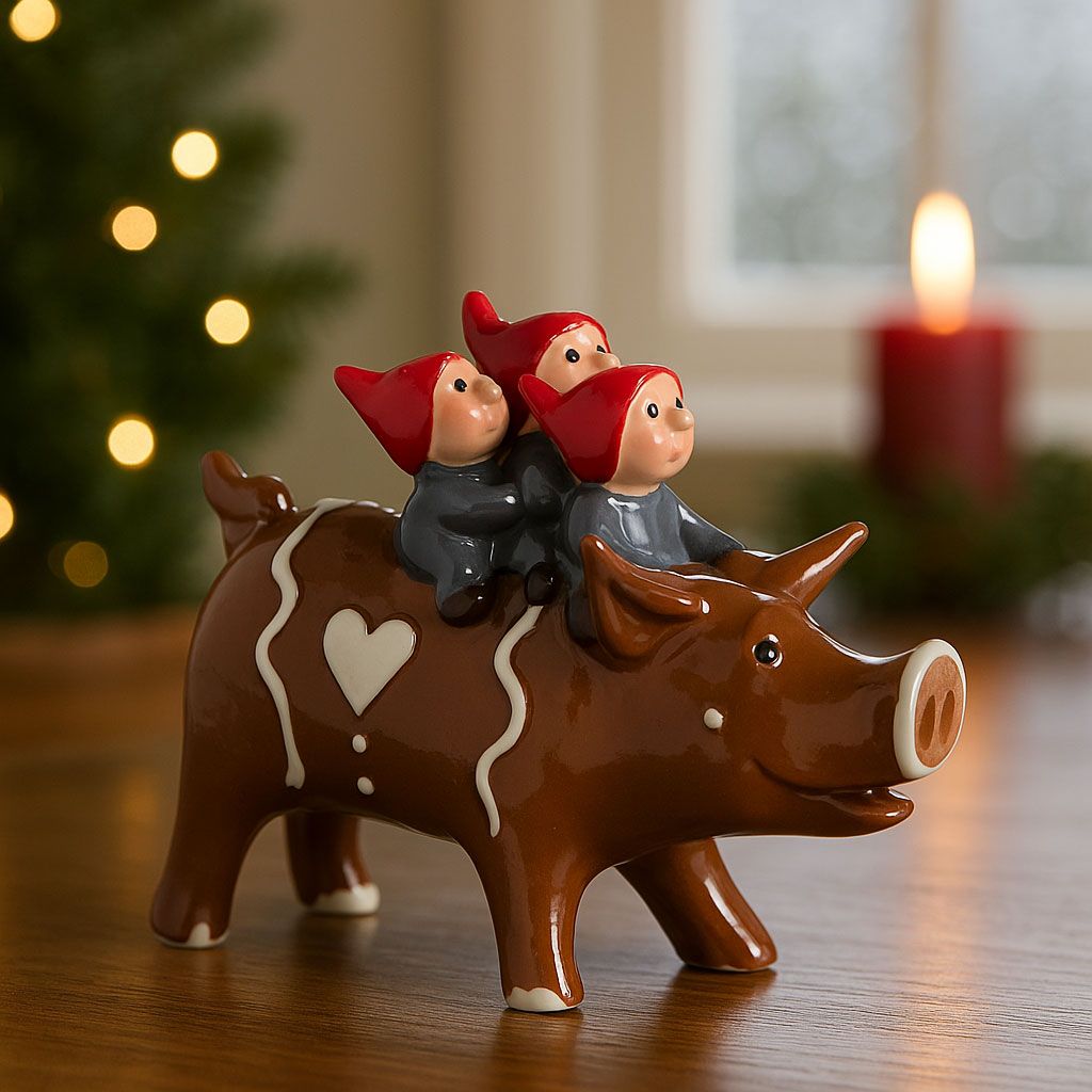 Tre små tomtenissar har hoppat upp på ryggen av en pepparkaksgris och ger sig ut på ett glatt vinteräventyr! Figuren är fylld av värme, humor och klassisk julkänsla – ett riktigt blickfång som sprider glädje var den än placeras.
