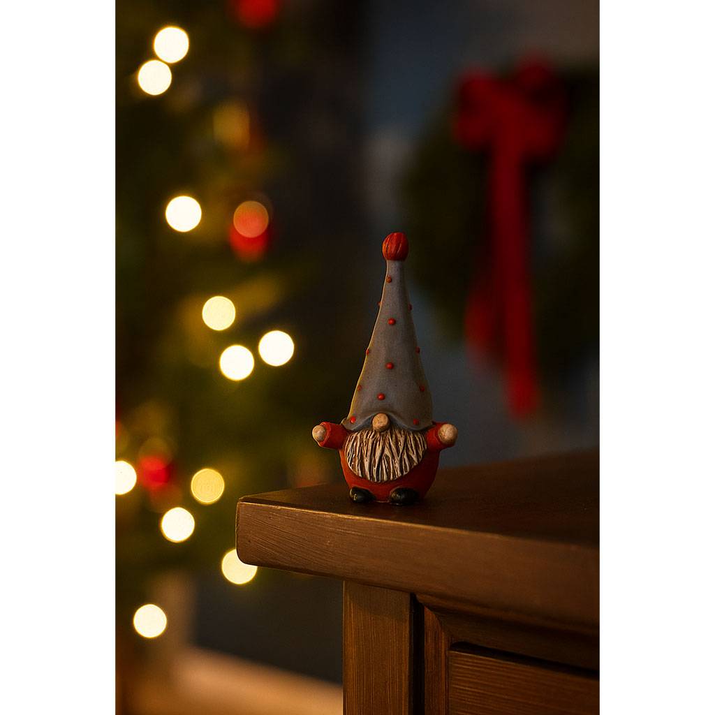 Varje Hugo är handmålad med stor omsorg, vilket gör varje tomte unik. Den matta grå färgen i mössan kontrasterar vackert mot de röda kläderna och den gyllene skägget – ett klassiskt och tidlöst uttryck som passar perfekt på spiselkransen, i fönstret eller bland granriset på julbordet.