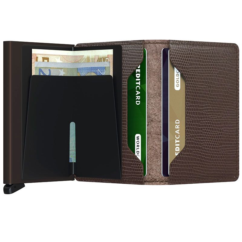 Kortskyddet är hjärtat i SECRID wallet. Genom att skjuta en liten spak åt sidan, förs dina kort ut ur kortskyddet i en överlappande sekvens. Detta kan du göra utan att ens öppna övriga delar av din plånbok och du hittar snabbt det kort du vill använda. Du plockar endast fram ett kort när du ska betala och så länge de andra finns kvar i aluminiumskalet, kan obehörig utrustning inte läsa av korten. Risken minimeras på detta vis ytterligare.
