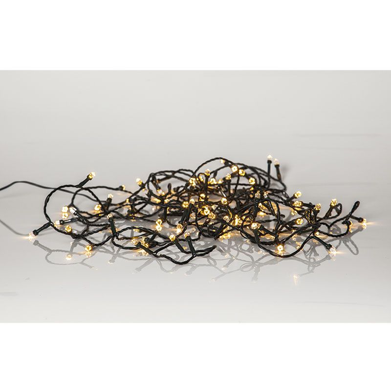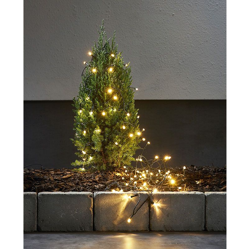 Ljusslinga med 100 varmvita ljuskällor och grön kabel för utomhusbruk. Ljusskenet från slingan har en effekt av stjärnreflektion. Jättefin att dekorera med i trädgården och i granen.