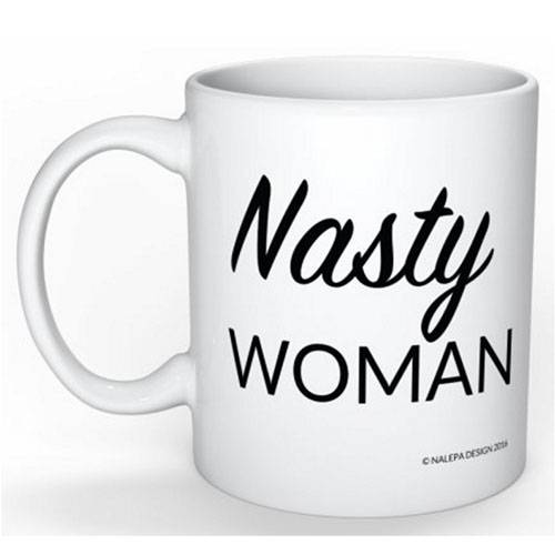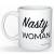 En rolig vit te- eller kaffemugg med text. På ena sidan står det "Nasty Woman" och på den andra, "I'm the Perfect Me". Bara för att boosta ditt sjävförtroende.