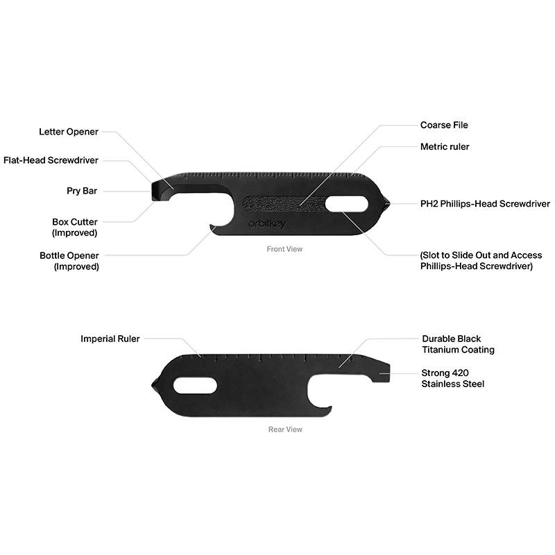 Nio verktyg i en tunn profil: Lådskärare, flasköppnare, bändstång, plattskruvmejsel, PH2-skruvmejsel, brevöppnare, metrisk linjal, imperial linjal och en grov fil.
