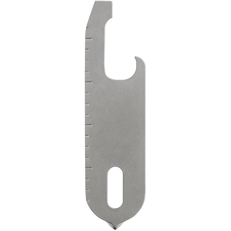 Nio verktyg i en tunn profil: Lådskärare, flasköppnare, bändstång, plattskruvmejsel, PH2-skruvmejsel, brevöppnare, metrisk linjal, imperial linjal och en grov fil.