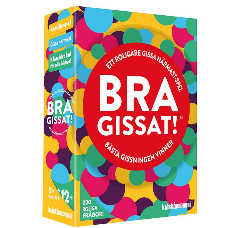 Bra gissat! är ett verkligt underhållande spel med över 200 roliga och intressanta frågor där det gäller att gissa närmast. Här behöver man aldrig kunna det rätta svaret utan bästa gissningen tar hem poängen och vem som helst kan vinna. Träffar du mitt i prick och svarar helt rätt så kammar du dessutom hem massa extrapoäng!