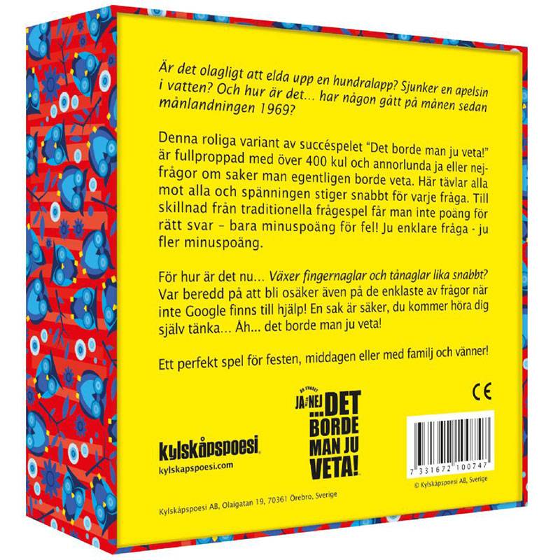 Denna roliga variant av succéspelet ”Det borde man ju veta!” är fullproppad med över 400 kul och annorlunda ja eller nej frågor om saker man egentligen borde veta. Här tävlar alla mot alla och spänningen stiger snabbt för varje fråga. Till skillnad från traditionella frågespel får man inte poäng för rätt svar – bara minuspoäng för fel! Ju enklare fråga desto fler minuspoäng.