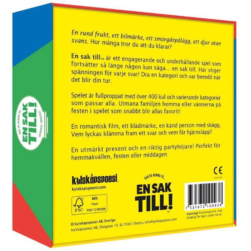 En sak till är ett engagerande och underhållande spel som fortsätter så länge någon kan säga… en sak till. Här stiger spänningen för varje svar! Dra en kategori och var beredd när det blir din tur.