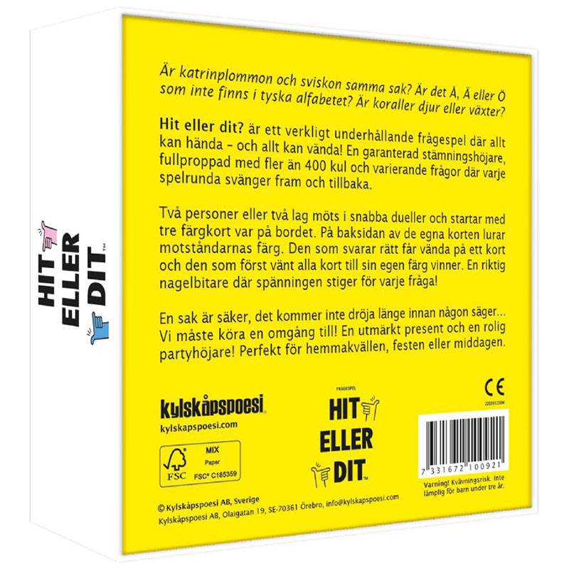Hit eller dit? är ett verkligt underhållande frågespel där allt kan hända – och allt kan vända! En garanterad stämningshöjare, fullproppad med fler än 400 kul och varierande frågor där varje spelrunda svänger fram och tillbaka.