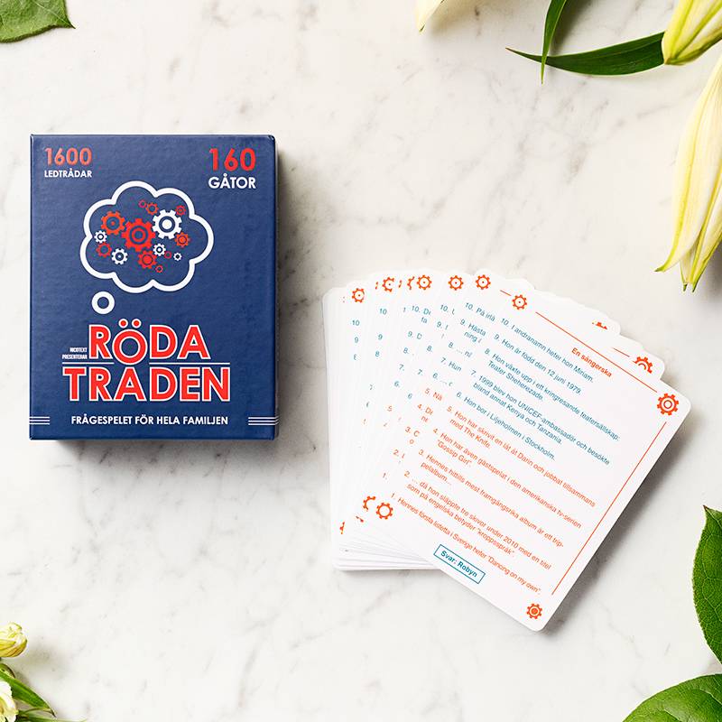 Röda Tråden är ett spel för hela familjen där det gäller att koppla ihop tio till synes udda saker för att komma fram till den gemensamma nämnaren. För varje ledtråd blir det lättare att lösa gåtan, men det är inte alltid den som har levt längst eller läst mest som kan klura ut det rätta svaret.