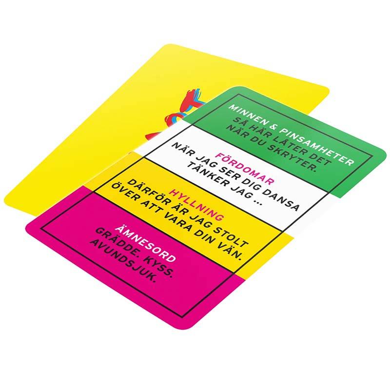 På varje spelkort finns fyra kategorier som hjälper er att roasta varandra.