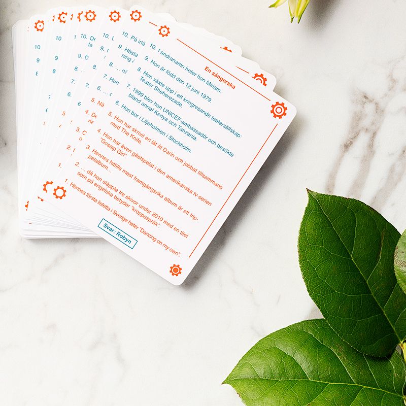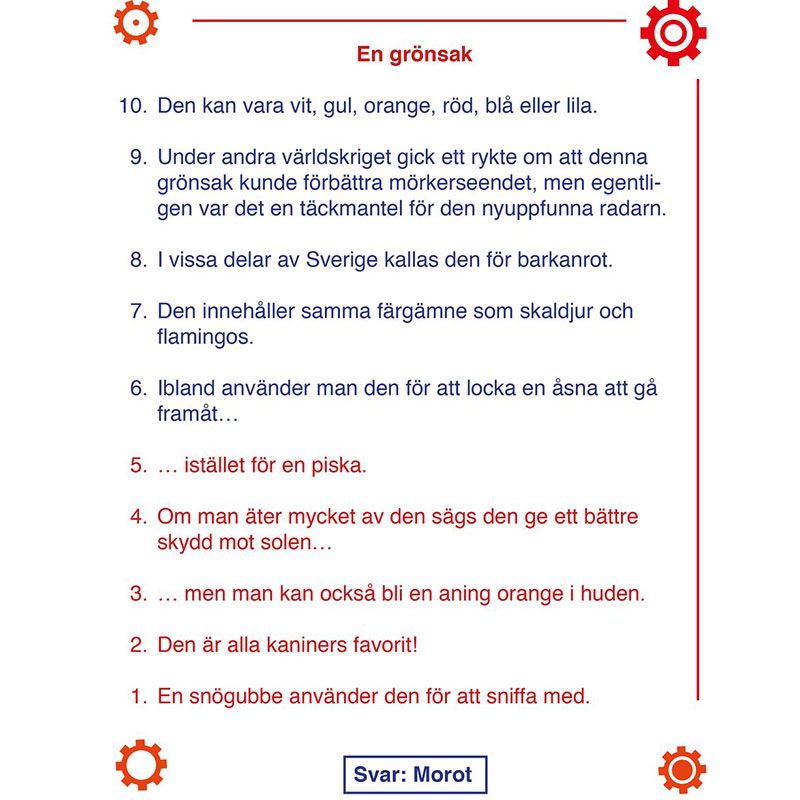 För varje kort lär du dig något nytt om allt från vanliga svenska uttryck, djur, kända personer, sagofigurer eller spännande uppfinningar samtidigt som du och dina vänner har trevligt tillsammans.