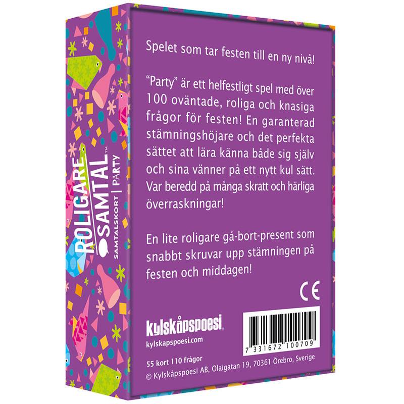 ”Party” är ett helfestligt spel med över100 oväntade, roliga och knasiga frågor för festen! En garanterad stämningshöjare och det perfekta sättet att lära känna både sig själv och sina vänner på ett nytt kul sätt. Var beredd på många skratt och härliga överraskningar!