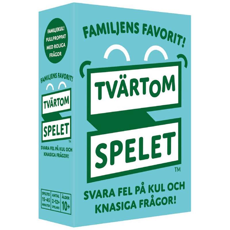 Tvärtomspelet – Familjens favorit är ett kul spel som snabbt blir hela familjens favorit – på kalaset, på resan eller hemma i soffan. Här gäller det att snabbt försöka svara fel, alltså tvärtom, på knasiga och kul frågor. Svara Ja istället för Nej och Nej istället för Ja. Var beredd på roliga felsägningar och massvis av skratt!